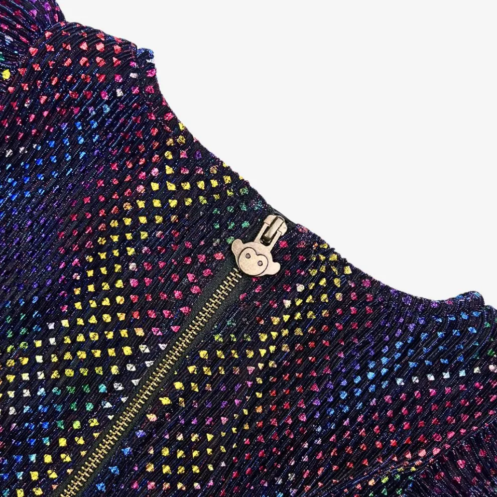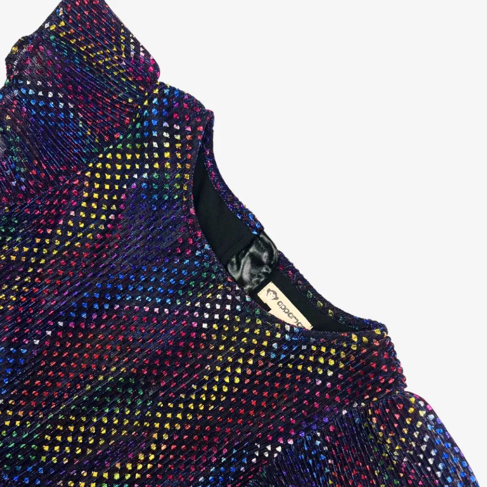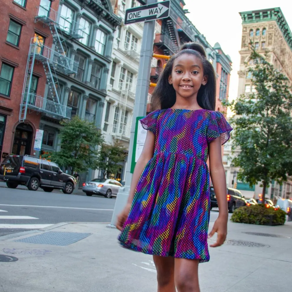 The Ellie Dress is perfect for girl who loves color! This dress features a multi-colored metallic dot design and fluttery cap sleeves to add elegance. This colorful dress is sure to be the highlight of any occasion!