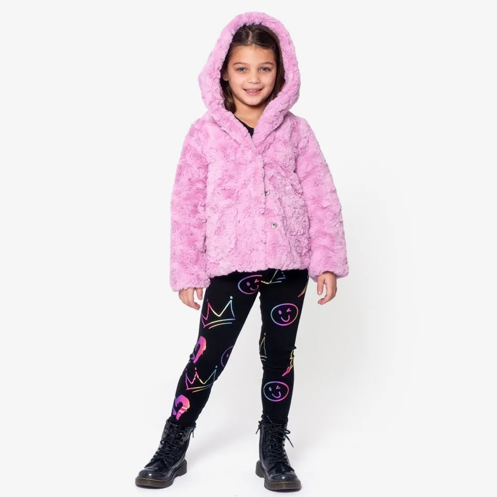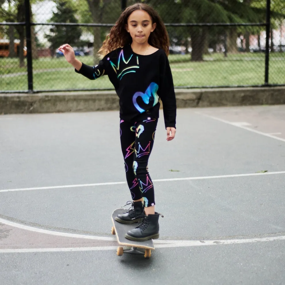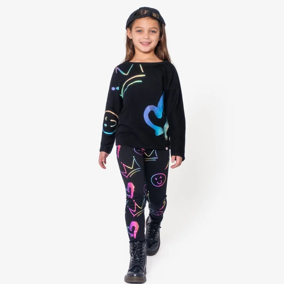Comfortable and stretchy black graffitied leggings featuring smileys, hearts, and crowns for your little queen. Match perfect with the Graffiti Slouchy Sweatshirt!